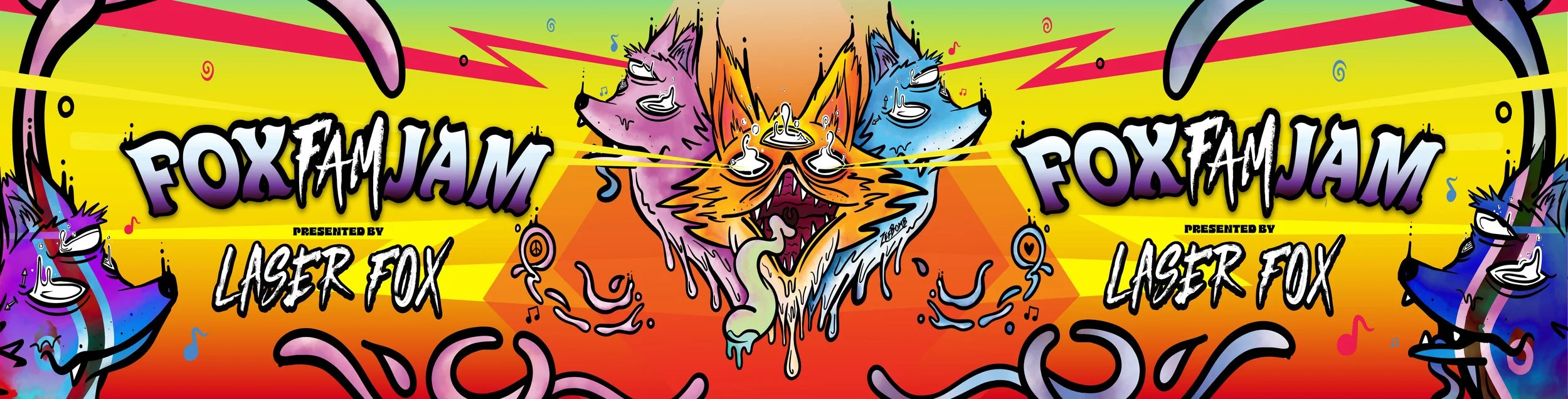 Colorful graphic illustration with three distorted fox heads, surrounded by musical notes, lightning bolts, and hearts, promoting Fox Fam Jam presented by Laser Fox.